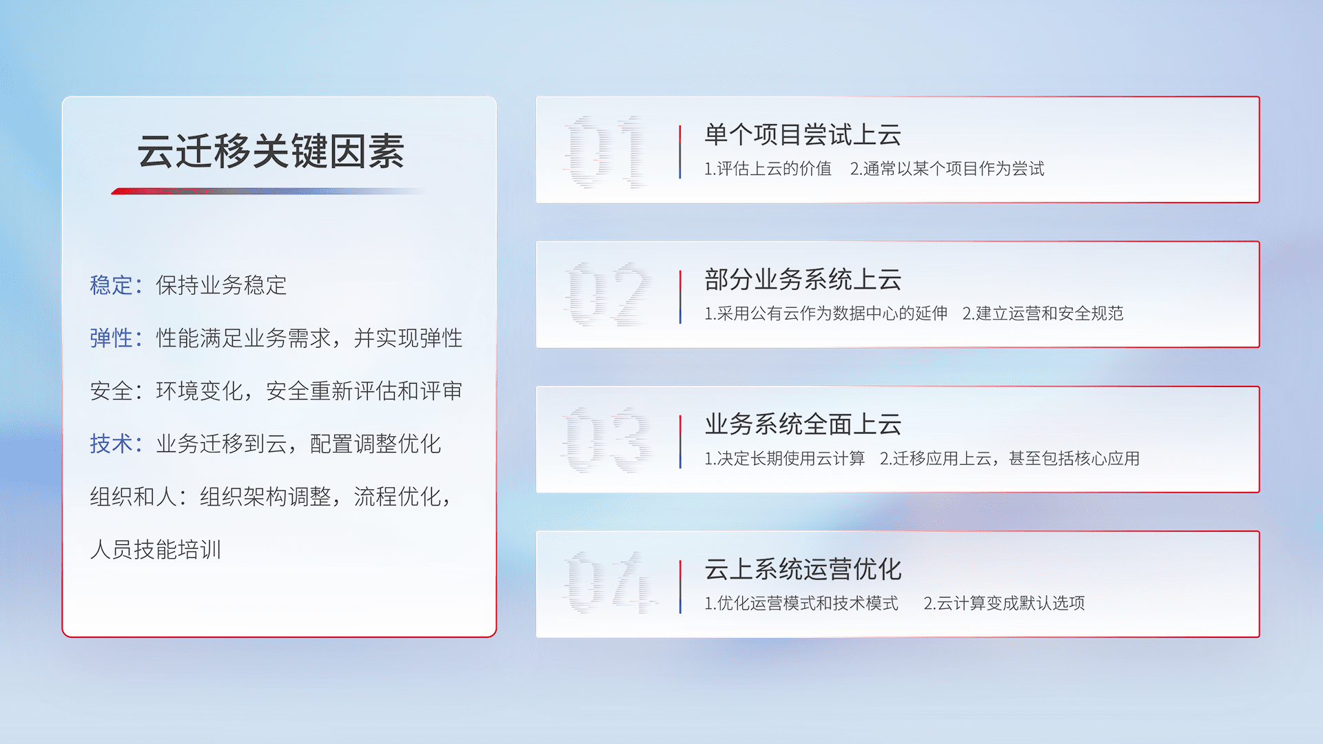 结合实际业务,,,从规划设计、、云平台选型、、、、云原生改造、、、、数据迁移、、集成交付,,,迁移全过程为客户识别最佳上云路径,,,,做好风险识别管理,,,,设计网络架构、、、身份权限、、、、安全审计合规、、、、操作审计、、、日志审计、、、、监控告警策略、、、、多站点容灾设计等,,对云上基础设施进行整体规划,,提升IT治理水平,,,以满足弹性、、高可用、、、高性能的需求。。。